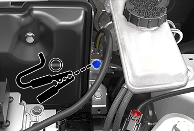 - חברו את הכבל השלילי (-) השחור של ספק המתח הנמוך החיצוני לבורג הממוקם לצד אגן נוזל הבלמים. הבורג משמש כמיקום הארקה לסיוע חיצוני.