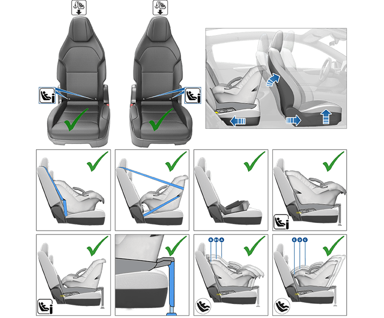 - Use a child restraint system that is appropriate for the specific seating position in Model Y. Each passenger seat supports a broad range of options. For details on what type of child restraint system can be used in each passenger seat, see Front Passenger Seat and Second Row Seats.